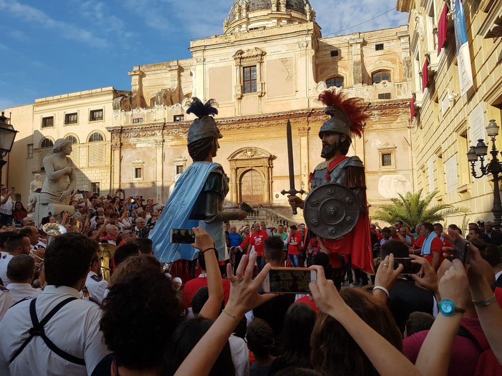 Accompagnati da più di 100 persone e dal corpo bandistico Città di Mistretta, i Giganti hanno sfilato per il Cassaro da via Maqueda fino al piano della Cattedrale dove hanno ballato in onore di Santa Rosalia.