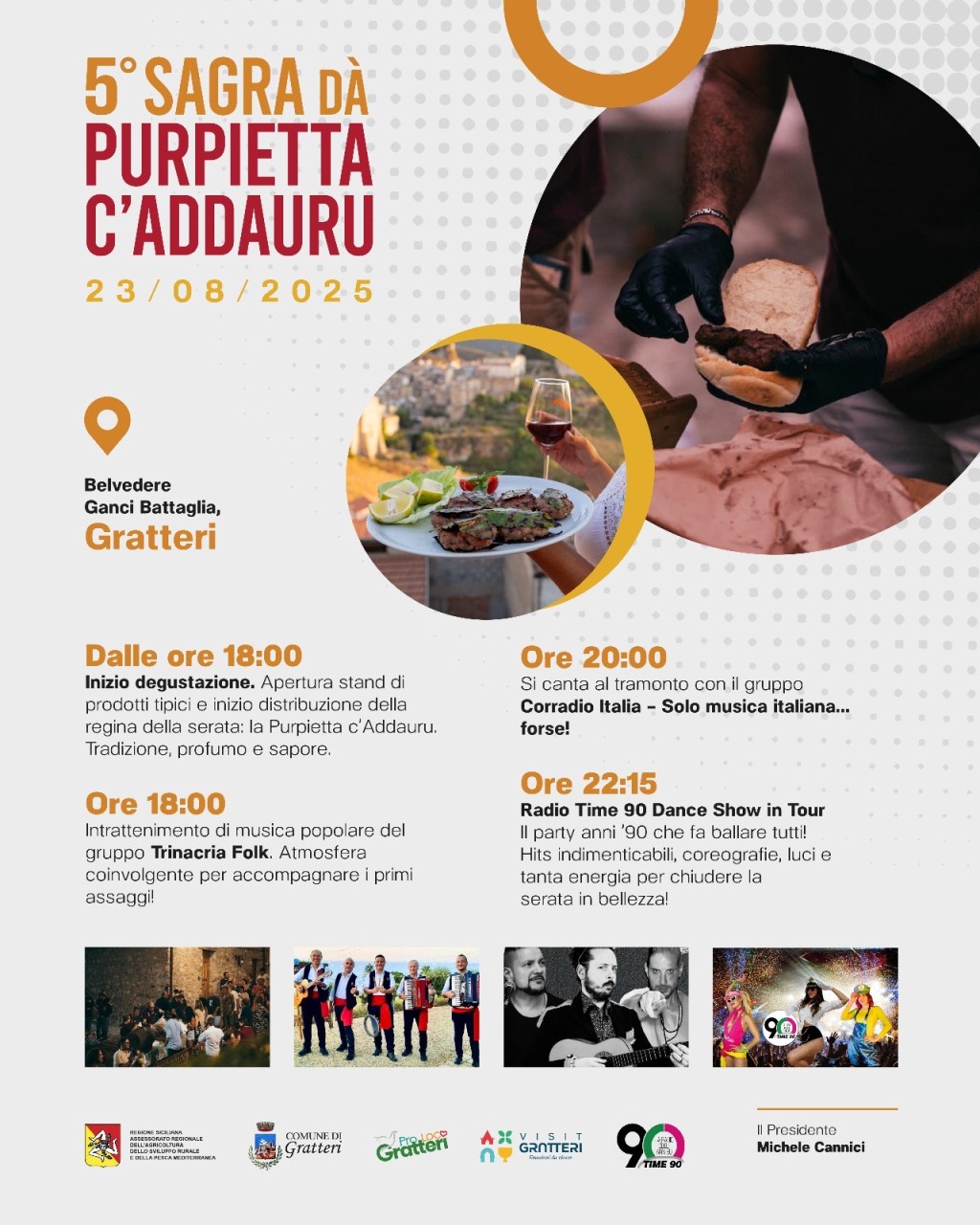 GRATTERI (PA) – Profumo d’estate, panorama mozzafiato e gusto autentico: il borgo madonita di Gratteri si prepara a vivere una serata indimenticabile con la 5ª Sagra da Purpietta c’Addauru, in programma sabato 23 agosto 2025 al Belvedere Ganci Battaglia. Un evento che unisce tradizione, convivialità e grande spettacolo, portando in piazza l’anima più vera della Sicilia.