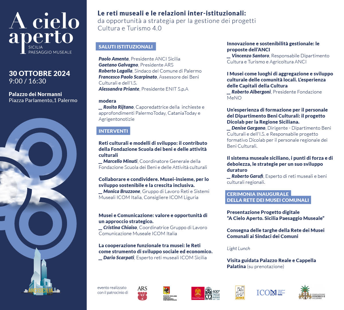 L’ANCI Sicilia per presentare al pubblico il progetto della Rete dei Musei Comunali ha organizzato il 30 ottobre dalle 9.00 alle 16.30 nella Sala Piersanti Mattarella di Palazzo dei Normanni (a Palermo) l’evento dal titolo “A Cielo Aperto. Sicilia Paesaggio Museale”, che si svolgerà in due momenti, nella prima parte con un Convegno e nella seconda parte con una cerimonia inaugurale.