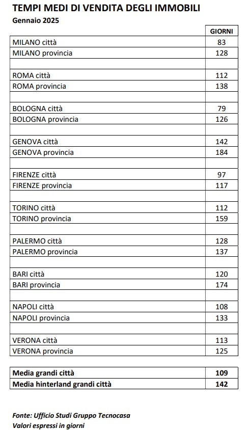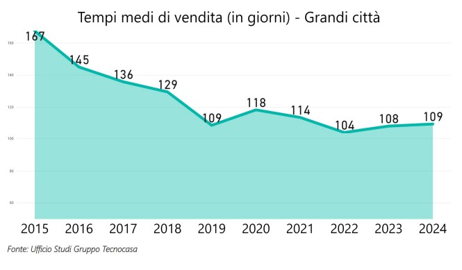 In quanti giorni si vende un immobile? A questa domanda ha risposto l’ufficio studi del gruppo Tecnocasa: i tempi di vendita nelle grandi città, a gennaio 2025, sono di 109 giorni. Si tratta di un dato simile a quello registrato un anno fa (108 giorni).