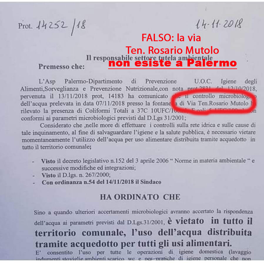 Gira in queste ore sui soliti social networks e nelle “chat” l’immagine, ritagliata ad arte, di una ordinanza sindacale CHE NON RIGUARDA PALERMO, in cui si parla di inquinamento da coliformi e si vieta l’utilizzo dell’acqua dell’acquedotto a fini alimentari. Per quanto riguarda Palermo si tratta di una clamorosa fake-news diffusa ad arte da qualche imbecille che denunceremo per procurato allarme”.