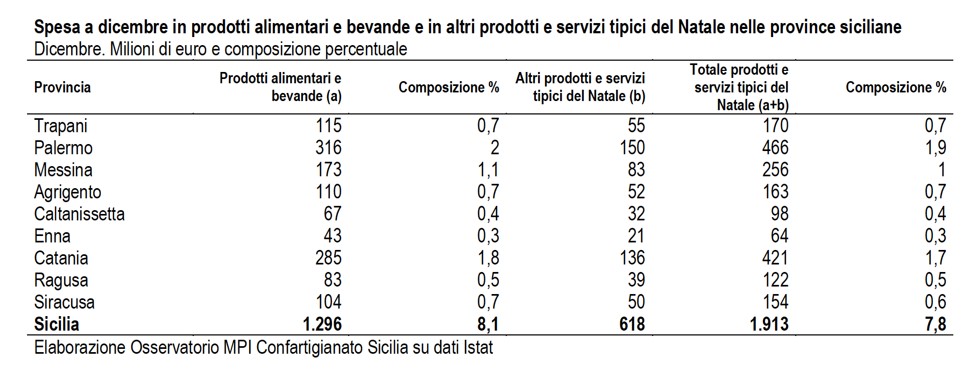 In chiave provinciale, la spesa delle famiglie a dicembre, nel perimetro merceologico in esame, ammonta a 466 milioni di euro a Palermo, a 421 milioni di euro a Catania, a 256 milioni di euro a Messina, a 170 milioni di euro a Trapani, a 163 milioni di euro ad Agrigento, a 154 milioni di euro a Siracusa, a 122 milioni di euro a Ragusa, a 98 milioni di euro a Caltanissetta e a 64 milioni di euro a Enna.