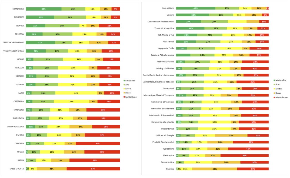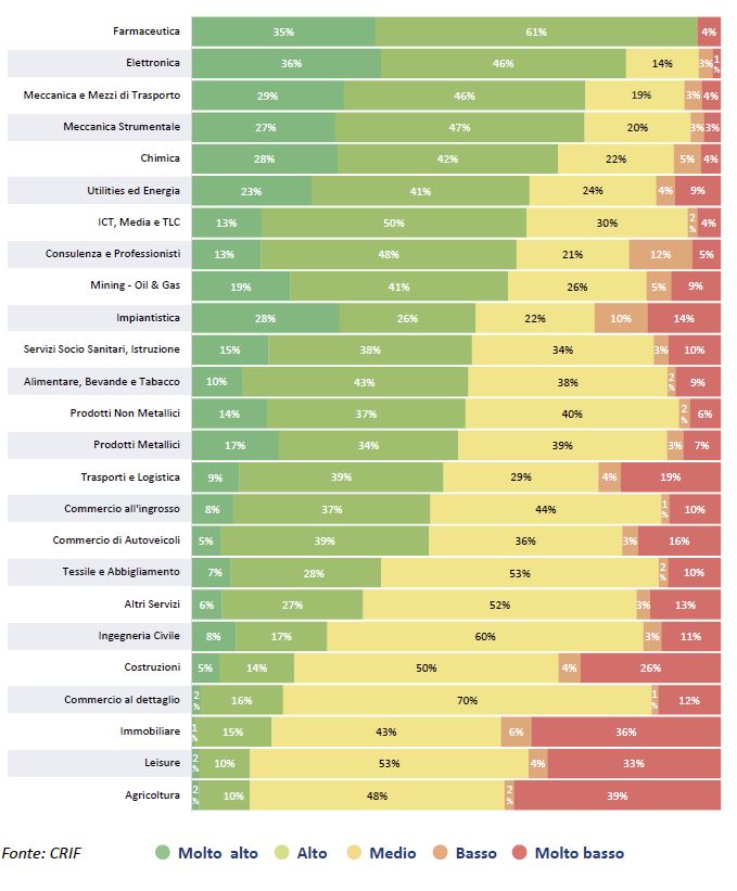 Di contro, aziende agricole, turistiche, di costruzioni e immobiliari sono i comparti con i livelli più bassi. Ancora una volta, le aziende con maggiori dimensioni e fatturato risultano avere una maggiore capacità di adeguamento.