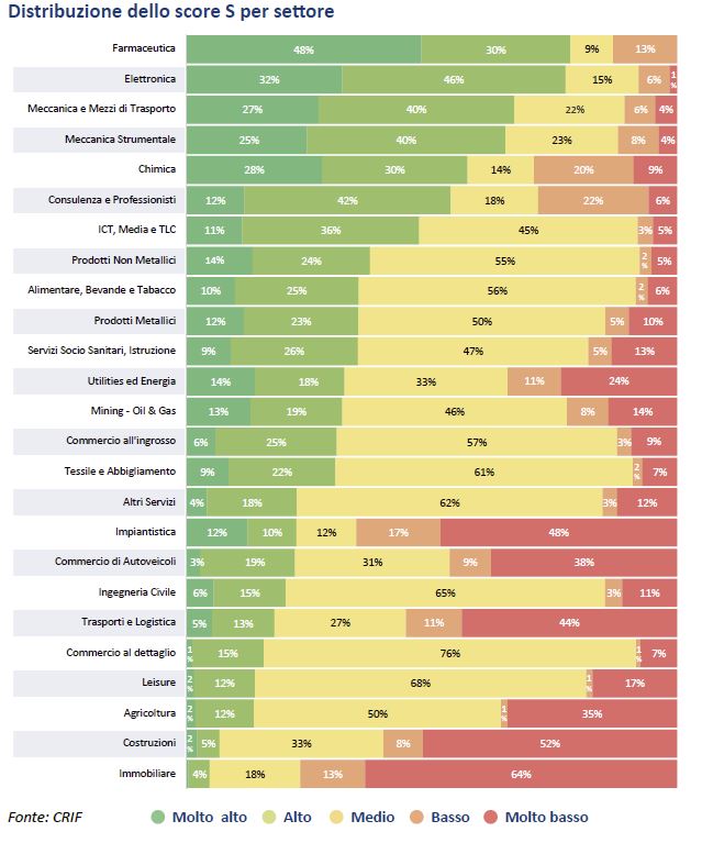 Se si considera invece l’aspetto della sostenibilità sociale, è il settore farmaceutico – con il 48% delle sue imprese con un livello di adeguatezza molto alto – a essere quello più avanti nel percorso di transizione sostenibile, mentre oltre un terzo delle aziende agricole presenta un forte ritardo.