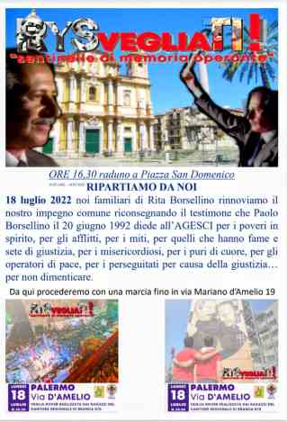 “Noi familiari di Rita Borsellino – dicono – rinnoviamo il nostro impegno comune riconsegnando il testimone che Paolo Borsellino il 20 giugno del 1992 diede agli scout dell’Agesci per i poveri, in spirito, gli afflitti, per i miti, per quelli che hanno fame e sete di giustizia, per i misericordiosi, per i puri di cuore, per gli operatori di pace, per i perseguitati a causa della giustizia, per non dimenticare”.