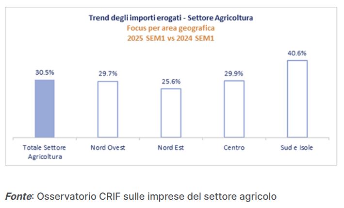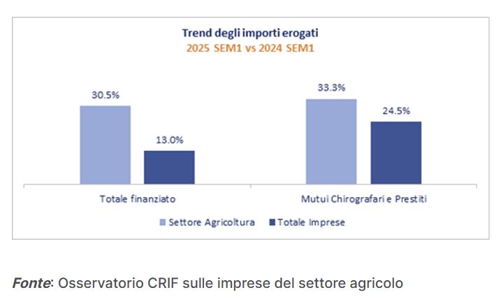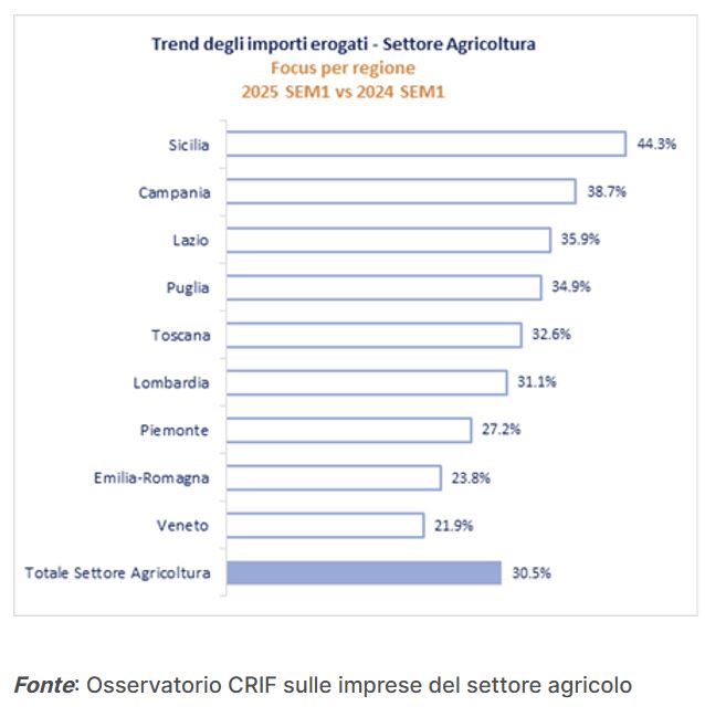 Nel primo semestre 2025 le imprese del settore agricolo hanno registrato un significativo incremento degli importi finanziati: +30,5% rispetto allo stesso periodo dell’anno precedente. Confrontando questo dato con la media delle imprese italiane (+13%), si evidenzia una differenza di oltre 17 punti percentuali. Questa maggiore crescita è stata trainata principalmente dai mutui chirografari e dai prestiti, che rappresentano la forma di finanziamento più diffusa per gli operatori del comparto (circa i due terzi del totale erogato): +33,3% per l’Agricoltura contro il +24,5% osservato sul totale delle imprese italiane.