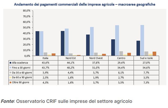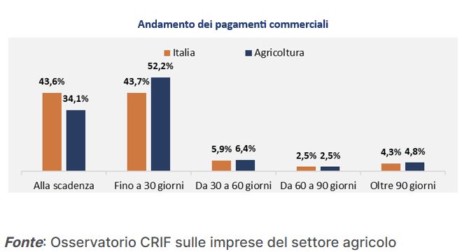 La valutazione delle abitudini di pagamento commerciale costituisce una tematica rilevante per comprendere le dinamiche del comparto agricolo. Facendo un confronto con l’economia italiana nel suo complesso, si evidenzia una minore regolarità nei pagamenti da parte delle imprese agricole rispetto alla media nazionale. In Italia, il 43,6% delle imprese paga alla scadenza, mentre nel settore dell’agricoltura tale quota si ferma al 34,1%. Sul fronte dei ritardi brevi, il settore agricolo ricorre più spesso a pagamenti entro 30 giorni dalla scadenza (52,2% contro il 43,7% della media nazionale). Anche i ritardi più lunghi, oltre i 90 giorni, risultano leggermente più frequenti nel comparto agricolo (4,8% rispetto al 4,3%), sebbene il divario sia meno marcato.