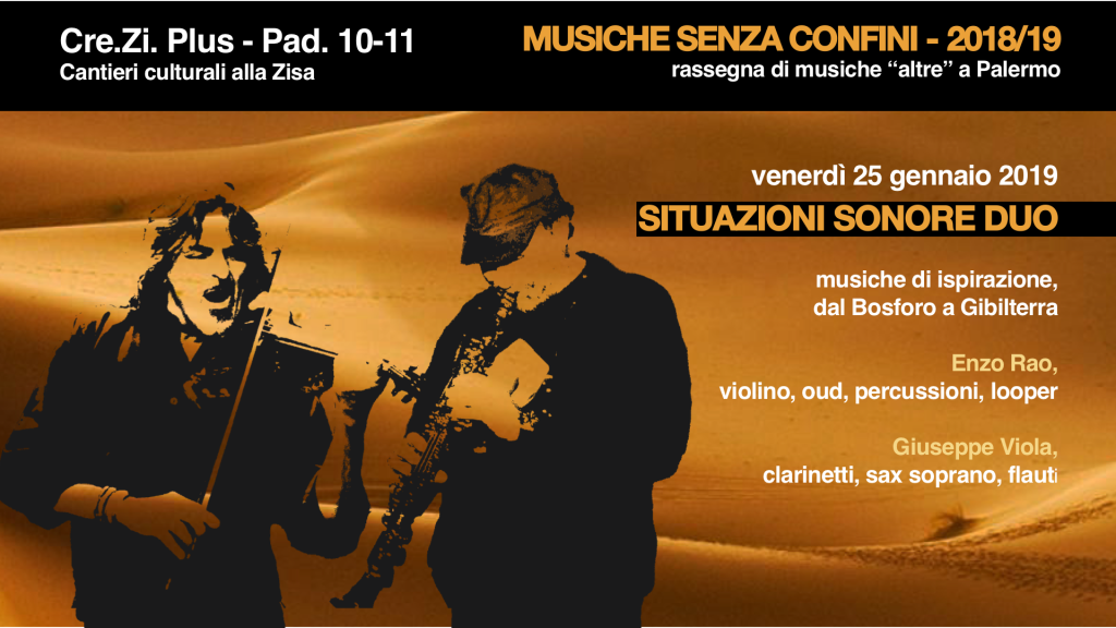Venrdì 25 gennaio ai Cantieri Culturali della Zisa di Palermo, presso lo spazio Cre.Zi.Plus prosegue “Musiche Senza Confini”, rassegna musicale organizzata dall’Associazione Culturale Formedonda. La rassegna è dedicata alle proposte musicali nazionali e internazionali che uniscono suoni di matrice mediterranea e l’uso di tecnologie moderne oltre che influenze di altri generi musicali.