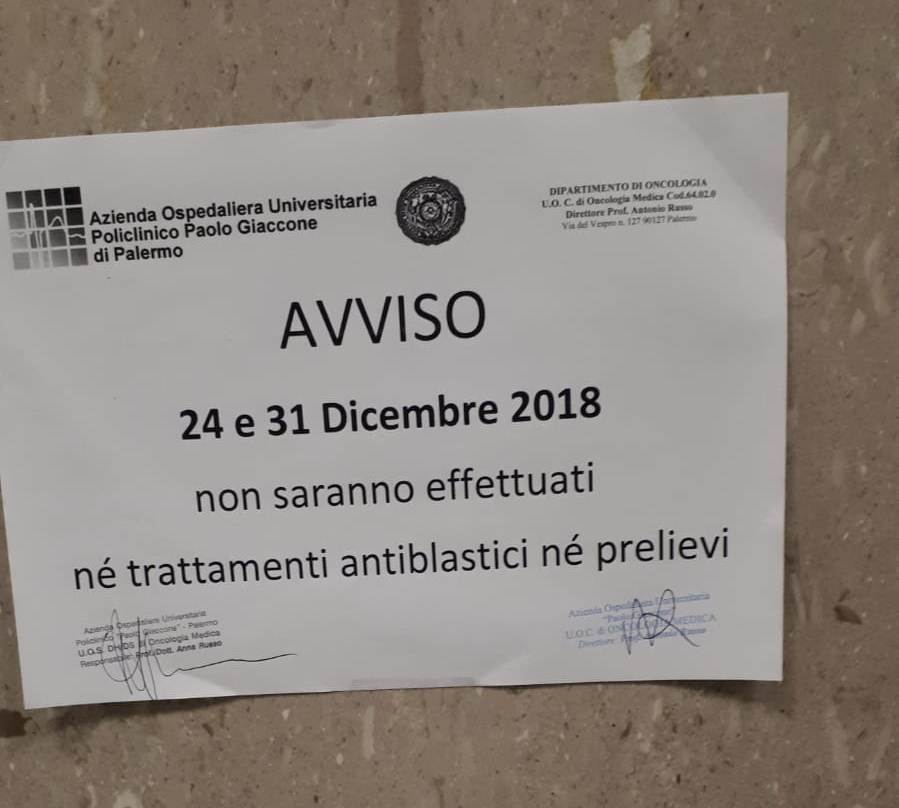 “Nel reparto di oncologia medica della clinica universitaria – dicono Gelarda e Ficarra – prima delle feste è comparso questo avviso: nei giorni 24 e 31 dicembre non saranno effettuati né trattamenti antiblastici, né prelievi. Praticamente significa – spiegano gli esponenti del Carroccio – lo stop alle terapie chemioterapiche sia per il ponte di Natale che per quello di Capodanno”.