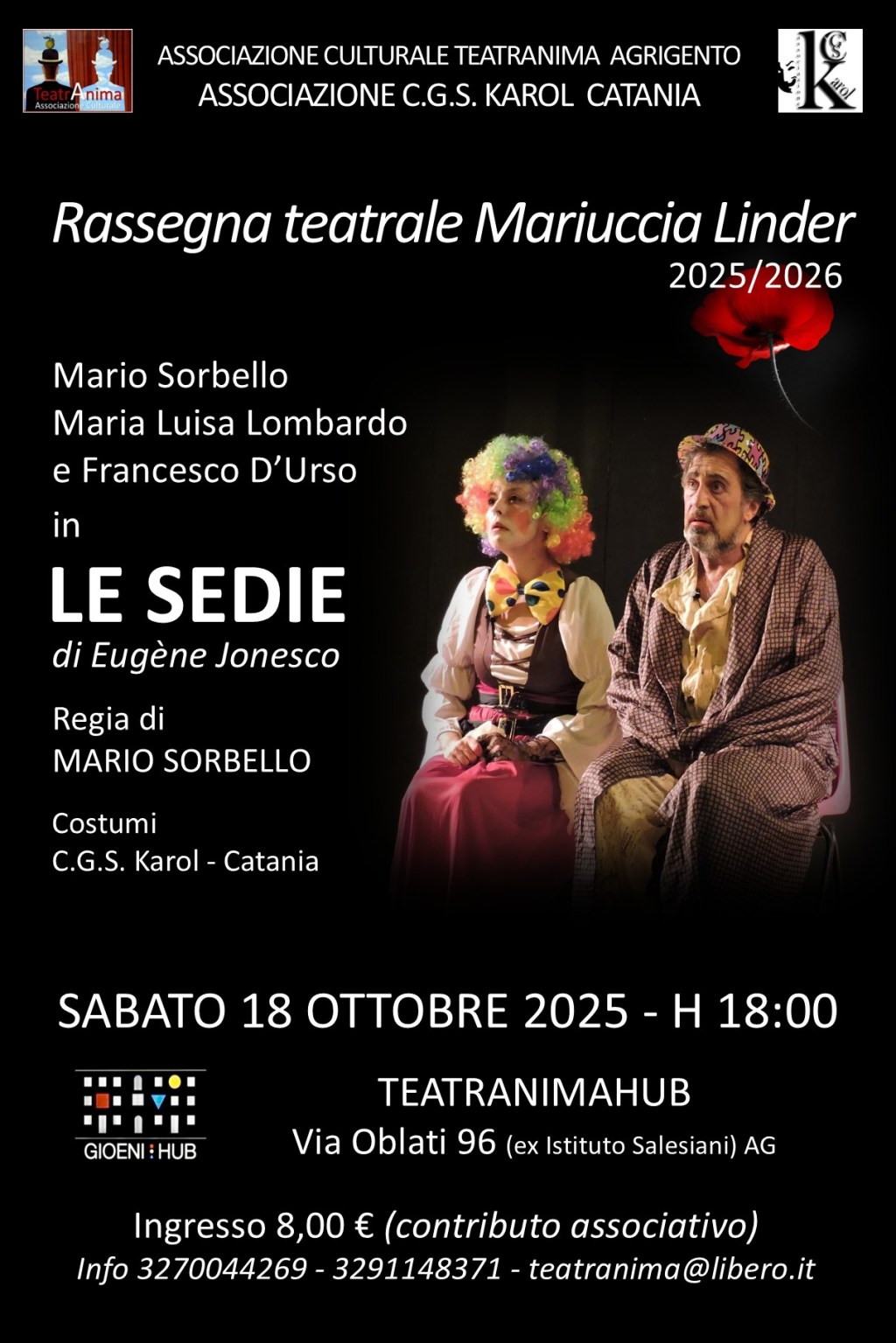 Sabato 18 ottobre, alle ore 18:00, nella sala del Teatranimahub, il nuovo centro culturale realizzato dalla Associazione Culturale TeatrAnima all’interno dell’ex Istituto Gioeni/Salesiani di Via Oblati 96, andrà in scena “Le sedie” farsa tragica appartenente al filone del teatro dell’assurdo, di Eugène Jonesco. Interpreti Mario Sorbello, Maria Luisa Lombardo e Francesco D’Urso. Regia Mario Sorbello.