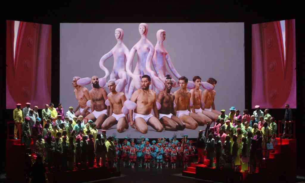 L’opera sarà ambientata non al tempo delle favole, ma nel futuro delle prossime generazioni: un futuro coloratissimo dove i complessi paesaggi urbani fanno da sfondo a un popolo in abiti che ricordano le epoche dei totaliritasmi europei. Il regno di Turandot è un matriarcato che punisce gli uomini per lo stupro subìto dall’ava della principessa: lattei robot dalle sembianze vagamente femminili torturano gli sfortunati pretendenti e il palazzo di Turandot è un gigantesco drago che sorvola i cieli della città proiettando immagini tridimensionali che rappresentano i diversi aspetti della personalità della principessa.
