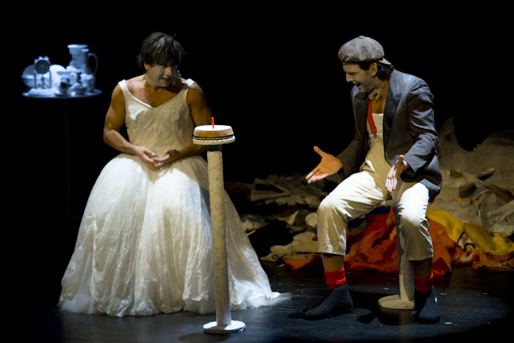 Due personaggi in scena, se ne stanno in un luogo che ha smesso di rivelarsi, a celebrare una cerimonia sghemba, che si annuncia inutile, una cerimonia che li obbliga a un dialogo che solo apparentemente è privo di senso, un dialogo disteso su di una lingua ruvida, deforme, asintattica e svirgolante, un dialogo straripante di silenzi pieni di paura, che man mano si trasforma, e diviene urlo, esigendo un ritmo da tragedia e una musicalità surreale. Fino al fallimento finale. Ché quello pretendono, i due, il fallimento, perché è la loro scelta, il solo modo che hanno per finire qualsiasi cosa pensano d’aver cominciato.