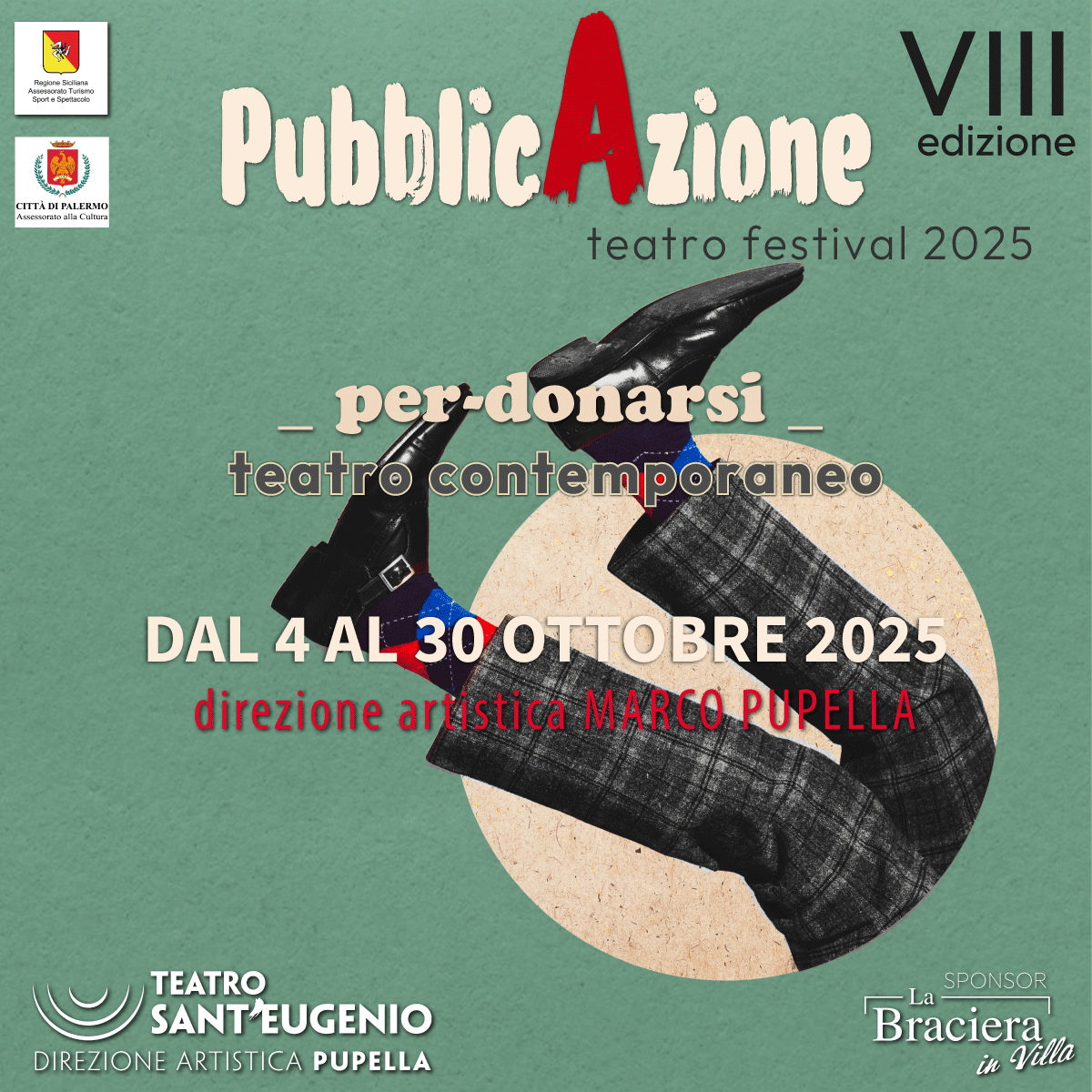 Al teatro Sant’Eugenio – Direzione artistica Pupella si rinnova l’appuntamento con il festival di teatro contemporaneo Pubblic-Azione, giunto alla sua VIII edizione che, quest’anno, ha il seguente sottotitolo: “Per-donarsi”. Gli spettacoli in rassegna sono sei ed andranno in scena dal 4 al 30 ottobre, con inizio alle ore 21 e alle ore 17.45 se in programma la domenica.