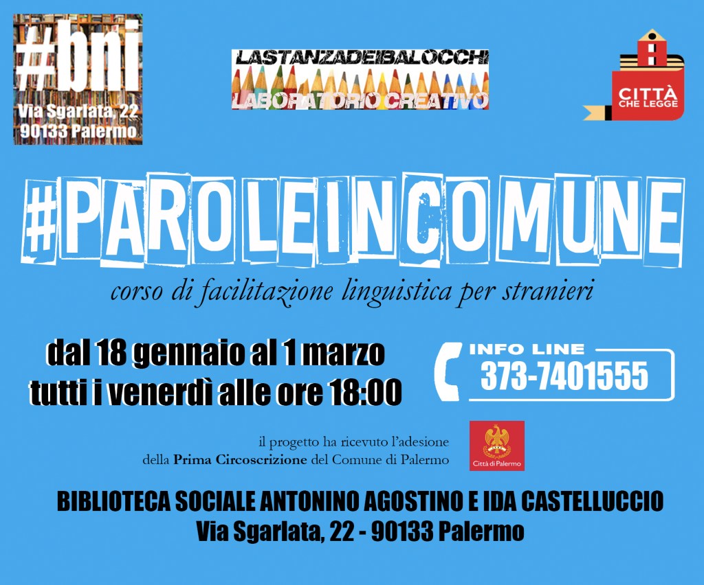 È previsto un settimo incontro conclusivo in cui sarà eseguita la simulazione del test ministeriale abilitante la conoscenza della lingua italiana di “Livello A”. #paroleincomune inizia venerdì 18 gennaio alle ore 18. L’iscrizione è gratuita ed è riservata a persone di nazionalità straniera che vivono a Palermo.