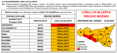 L’allarme rosso per gli incendi, invece, viene lanciato nella provincia di Agrigento dove i livelli di rischio di incendio a rapida propagazione sono molto elevati e si attivano le procedure di prevenzione e pre allarme delle sale operative.