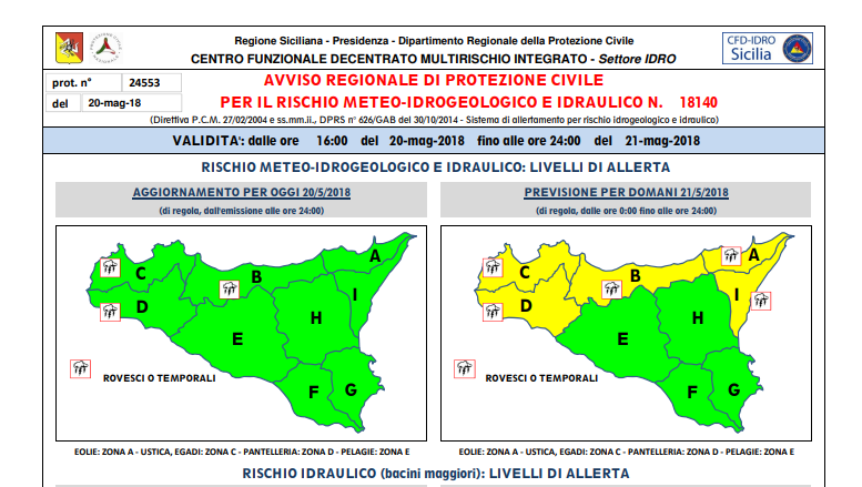 La Protezione Civile Regionale ha diramato un avviso di allerta per il rischio meteo-idrogeologico ed idraulico valido fino alle ore 24.00 di domani, 21 maggio.