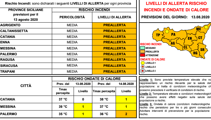 La Protezione Civile regionale ha diffuso un bollettino di allerta per rischio incendi e ondata di calore per le giornate del 13 e 14 agosto che prevede, per l’area di Palermo, rischio incendi arancione e ondate di calore livello 1 per giorno 13 e livello 2 per giorno 14, con temperatura massima di 36 gradi.