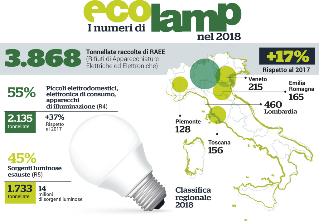 Sono 3.868 le tonnellate di RAEE – Rifiuti di Apparecchiature Elettriche ed Elettroniche – raccolte da Ecolamp nel 2018, con un incremento del 17% rispetto allo scorso anno. I piccoli elettrodomestici, l’elettronica di consumo e gli apparecchi di illuminazione (R4) costituiscono il 55% della raccolta, mentre il 45% è composto da sorgenti luminose esauste (R5).
