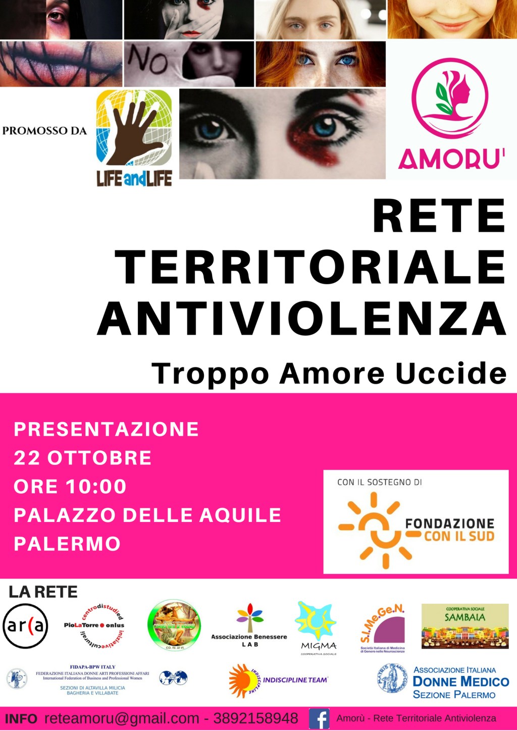 Unico in Sicilia tra i nove selezionati in tutto il Sud Italia è il progetto “Amorù – Rete Territoriale Antiviolenza – Troppo Amore Uccide”, promosso dall’ Organizzazione Umanitaria Internazionale LIFE and LIFE (LaL), ente capofila, e sostenuto da FONDAZION E CON IL SUD, che verrà illustrato alla stampa e alla città alle 10 di lunedì 22 Ottobre nella Sala Consiliare di Palazzo delle Aquile.