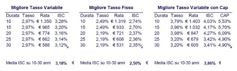 Entrando nel dettaglio delle migliori offerte di mutuo a tasso fisso e a tasso variabile presenti oggi sul mercato, la Bussola Mutui propone una simulazione prendendo in considerazione un esempio tipico di mutuo per acquisto casa di importo pari a 140.000 euro, con valore dell’immobile 220.000 euro e durata 25 anni: un richiedente di 35 anni può oggi rilevare un migliore tasso fisso pari al 2,19% e ottenere una rata mensile di 606 euro. Per la medesima operazione la migliore offerta di mutuo a tasso variabile presenta oggi un tasso variabile del 2,97% con una rata mensile di 662 euro, superiore di 56 euro rispetto alla rata dell’omologo mutuo a tasso fisso.