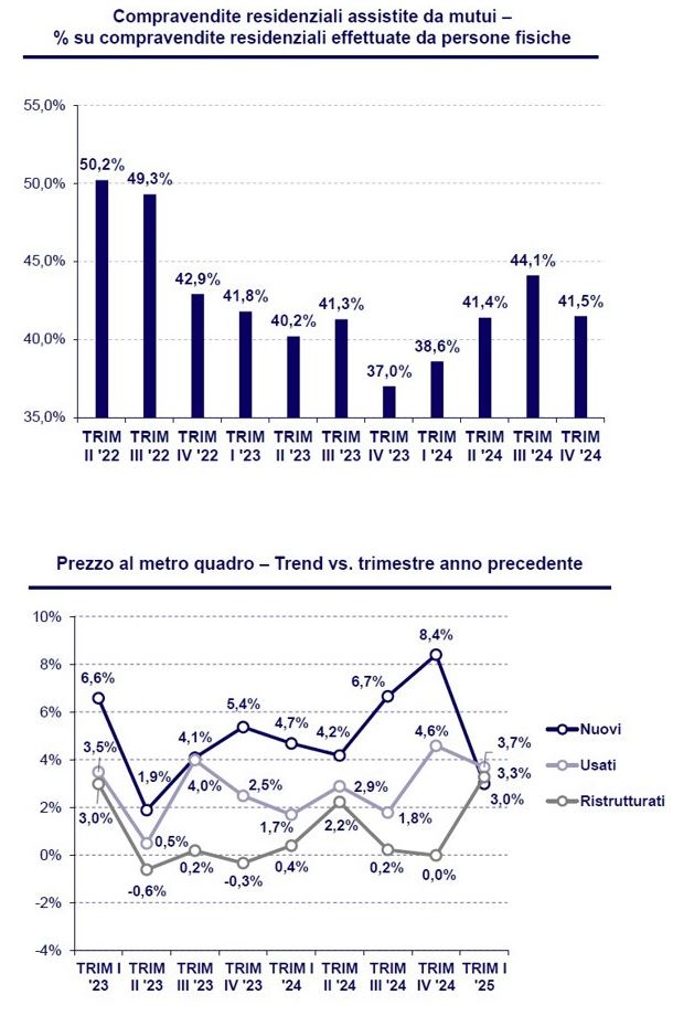 Con il recupero dell’interesse verso i mutui a sostegno dell’investimento sulla casa, nel quarto trimestre 2024 il mercato immobiliare conferma il consolidamento della ripresa segnando un +7,6%, dopo due trimestri di crescita alquanto stentata e dopo 18 mesi di contrazioni. Nell’ultimo trimestre 2024 la percentuale di compravendite residenziali effettuate grazie all’assistenza di nuovi mutui si attesta al 41,5%, in crescita rispetto al livello minimo del 37% registrato a fine 2023. La crescente convenienza dei mutui acquisto casa contribuisce, dunque, alla ripresa delle compravendite residenziali nel quarto trimestre 2024. Nel complesso, il 2024 segna un’inversione di tendenza registrando un aumento delle compravendite del +1,3% rispetto al 2023. Nonostante l’accelerazione dell’ultimo trimestre dello scorso anno, la crescita del 2024 risulta però limitata dal dato fortemente negativo del primo trimestre. Per quanto riguarda i valori di mercato, il prezzo/mq degli immobili oggetto di garanzia di mutuo ipotecario registra un nuovo incremento nel primo trimestre 2025. Più in dettaglio, gli immobili usati registrano un incremento del prezzo al metro quadrato pari al +3,7% e gli immobili nuovi segnano un incremento del +3%. Gli immobili ristrutturati segnano una crescita del +3,3%. Analizzando l’andamento dei prezzi a livello territoriale – sempre su base annuale – il maggiore incremento si rileva nel nord est con +8,4% seguito da sud e isole con +4,5%, dal nord ovest con +4,1%, mentre il centro registra la crescita più debole con un +2,7%. Infine, il valore medio dell’immobile oggetto di garanzia nel primo trimestre 2025 si posiziona attorno ai 175.000 euro, mentre la superficie commerciale media degli immobili offerti a garanzia del mutuo si riduce attorno a 109 mq.