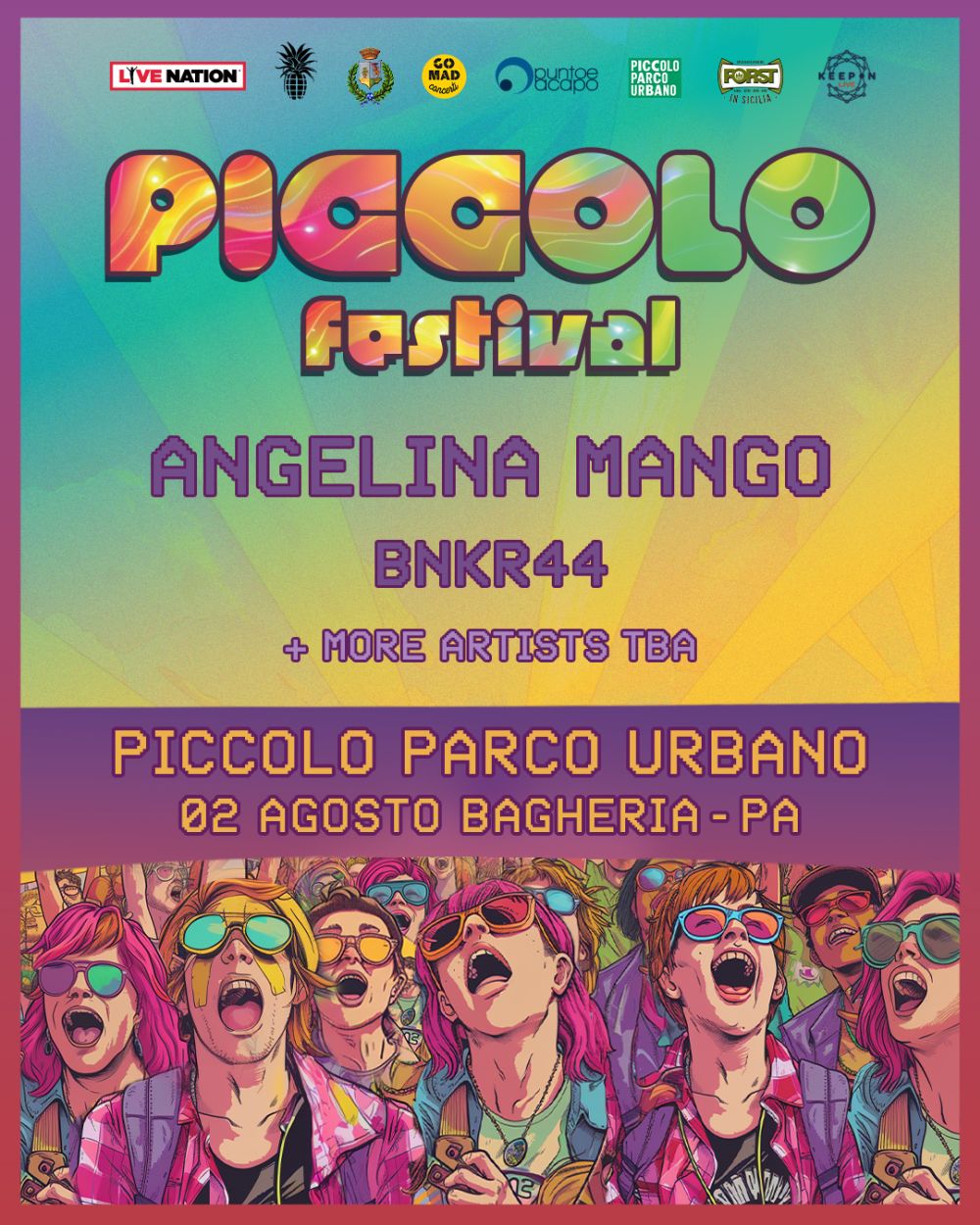 Angelina Mango (unica data in Sicilia), vincitrice del Festival di Sanremo 2024, e la band rivelazione BNKR44, sono i primi due artisti protagonisti della seconda edizione del piccolo festival – che nella prima edizione ha ospitato Chiello, Bresh e Giuse The Lizia – organizzato da GoMad Concerti, e Puntoeacapo concerti con la collaborazione del Comune di Bagheria, che si terrà il 2 agosto al piccolo parco urbano di Bagheria sei dischi di platino e due dischi d’oro per un totale di oltre 200 milioni di stream audio e video, un primo tour nei club completamente sold out, una data evento al Fabrique di Milano e una nuova leg nei club italiani anch’essi sold out con diversi raddoppi, al vertice delle classifiche di vendita e dei brani più trasmessi dalle radio.