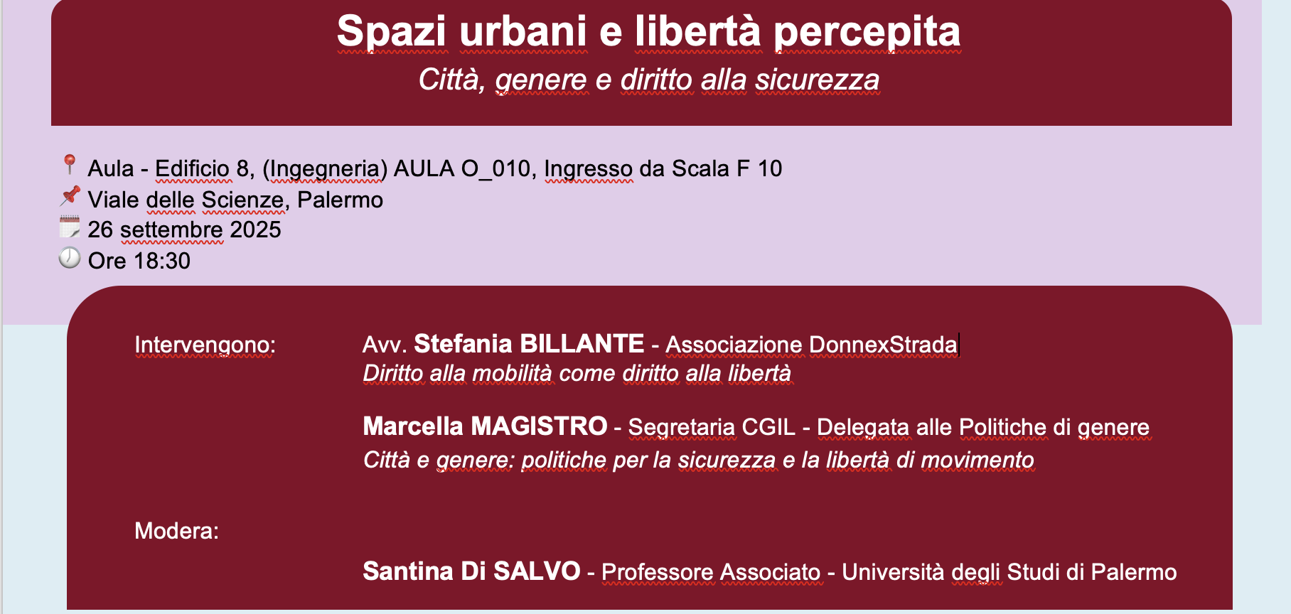 Nell’ambito di SHARPER 2025 – Notte dei Ricercatori, il seminario, ideato da Santina Di Salvo, docente del Dipartimento di Architettura dell’Università di Palermo, promuove un dialogo interdisciplinare tra diritto, politiche di genere e progettazione urbana sul tema della percezione di sicurezza negli spazi pubblici da parte delle donne. In un contesto in cui la paura può limitare la libertà di movimento, le opportunità lavorative e l’accesso allo spazio urbano, è urgente interrogarsi su come le città possano diventare più inclusive e sensibili alle esigenze di genere.