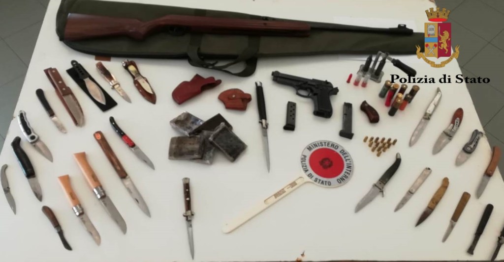 Gli agenti del commissariato di Brancaccio nel corso di una perquisizione in casa a Palermo hanno trovato una carabina ad aria compressa modificata, 18 coltelli con lame lunghe tra gli 8 ed i 15 cm., di cui 11 a serramanico, 3 con meccanismo a scatto, 2 da caccia e 2 a lama fissa, fondine per pistola, un salvapercussore ed una pistola a salve senza di tappo rosso, esattamente identica ad un modello vero.
