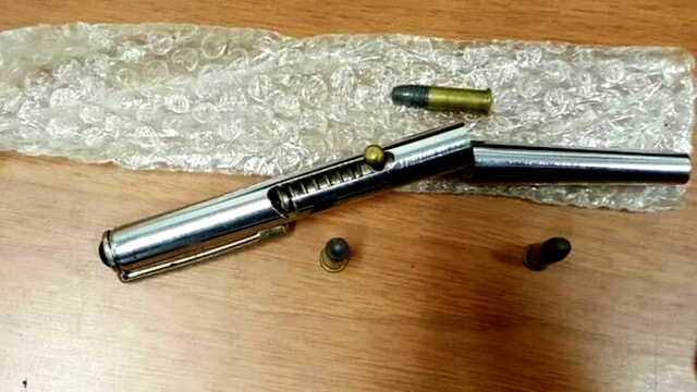 Nel corso della perquisizione è stato trovato in possesso dentro una tasca della tracolla un paio di guanti dove erano nascoste una penna pistola artigianale con il percussore e canna con 16 cartucce Gfl calibro 7,65.