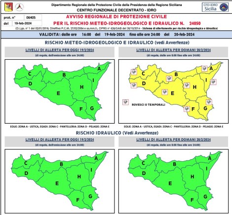 Tutte e nove le province della Sicilia sono interessate dall’allerta gialla diramata dalla protezione civile regionale. Indicate piogge e temporali ovunque con possibili disagi.