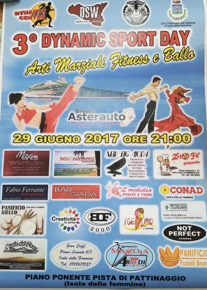 L’A.S.D. DYNAMIC SPORT CENTER di Palermo in collaborazione con L’A.S.D WHY NOT FITNESS di Isola Delle Femmine presentano la 3° edizione del “Dynamic Sport Day” , una manifestazione sportiva patrocinata dal comune con lo scopo di promuovere lo sport in tutte le sue discipline e nell’insegna del divertimento.