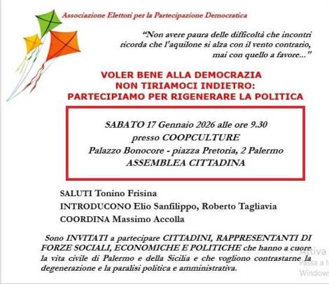 In un tempo segnato da crisi istituzionale, sfiducia e astensionismo, a Palermo si prova a ricostruire dal basso il senso della democrazia e dell’impegno collettivo. L’Associazione Elettori per la partecipazione democratica ha convocato una assemblea pubblica, domani, sabato 17 gennaio 2026, alle ore 9.30, presso Palazzo Bonocore, in piazza Pretoria.