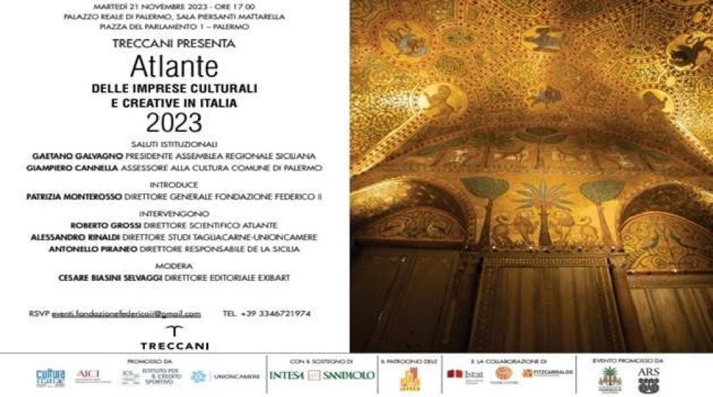 Sarà presentato martedì 21 novembre alle 17, al Palazzo Reale di Palermo (Sala Mattarella), l’“Atlante delle imprese culturali e creative in Italia 2023”, una mappa inedita, complessiva e di dettaglio dello stato del settore delle imprese culturali e creative, edito da Treccani e promosso da Cultura Italiae, Aici, Istat, Istituto Credito Sportivo, Unioncamere, con il sostegno di Intesa San Paolo, il patrocinio dell’Anci, la collaborazione di Federculture e Fitzcarraldo e la direzione di Roberto Grossi.