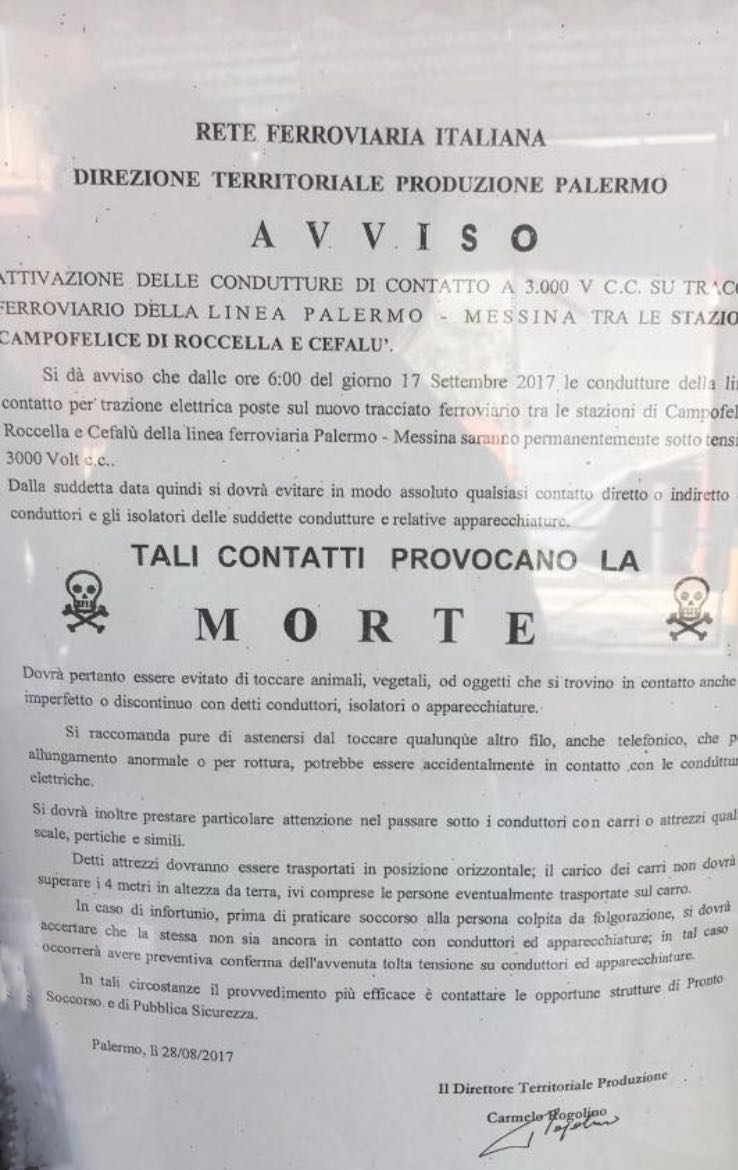 Già perché domenica 17 settembre ci sarà l’attivazione delle condutture di contatto della nuova linea ferroviaria Palermo Messina, proprio nel tratto tra Campofelice di Roccella e Cefalù. “Per quel giorno – si legge nell’avviso – si dovrà evitare in modo assoluto qualsiasi contatto diretto o indiretto con i conduttori o gli isolatori delle suddette condutture e relative apparecchiature. Tali contatti provocano la morte”.