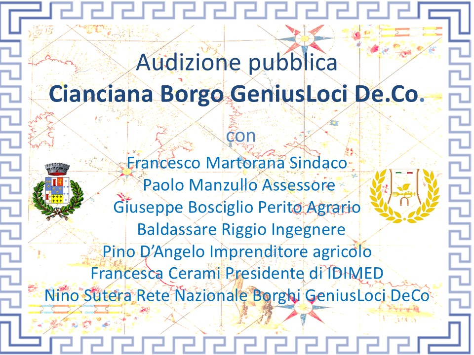 Il prossimo venerdì primo agosto, la cittadina di Cianciana, nell’ambito della Sagra Del Raccolto Dei Grani Antichi,Cereali e Legumi, sarà protagonista di un importante evento culturale dedicato alla valorizzazione del territorio e delle sue tradizioni enogastronomiche. Si svolgerà infatti l’audizione pubblica “Cianciana Borgo GeniusLoci De.Co.”, un percorso che mira a salvaguardare e promuovere chi con fatti concreti si adopera per la difesa identitaria del territorio. L’obiettivo del percorso della Rete Nazionale dei Borghi GeniusLoci DeCo, punta sul fascino della fascia tricolore, attraverso la De.Co. (Denominazione Comunale) un atto politico nelle prerogative del Sindaco per valorizzare l’immenso giacimento ElaioEnoGastronomico del territorio amministrato . Il Sindaco riceverà il riconoscimento della Rete Nazionale dei Borghi GeniusLoci DeCo, con questa motivazione, “Alla laboriosa Comunità di Cianciana si conferisce il riconoscimento di “Custode dell’Identità Territoriale” per aver saputo preservare e tramandare il GeniusLoci”.