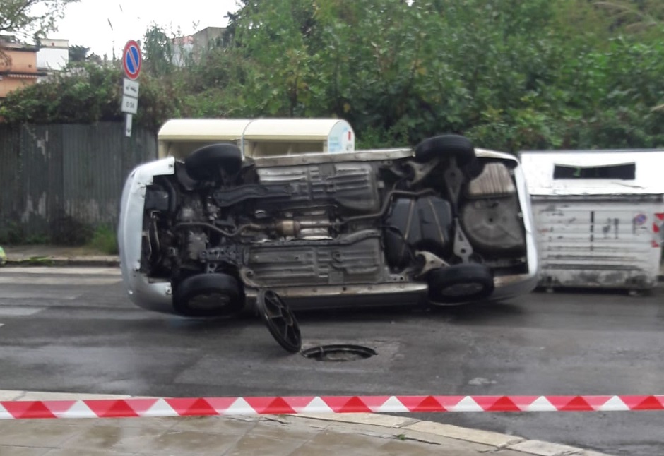Incidente in via Roccazzo a Palermo. Un’auto ha cappottato prendendo in pieno un tombino che era stato aperto per fare defluire l’acqua che aveva allagato la strada.