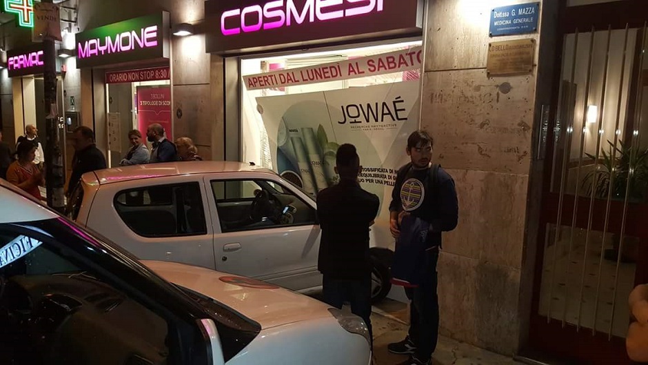 Drammatico incidente in via Catania a Palermo. Una donna ha perso il controllo della sua vettura e finisce dentro la vetrina della farmacia Maymone.