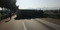 Per cause ancora da accertare un autotreno si è ribaltato su un fianco.