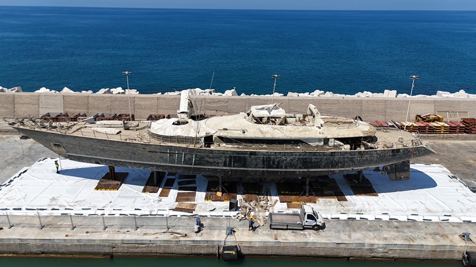 Lo scafo di 56 metri del Bayesian è stato finalmente recuperato dal mare sabato 21 giugno e trasportato per 12 miglia fino a Termini Imerese il giorno successivo dalla gru Hebo Lift 10. Lunedì scorso, è stato sollevato su pesanti supporti in acciaio che attendevano sulla banchina, appoggiati su una membrana antinquinamento. Ogni sezione di questa struttura progettata su misura, costruita nei Paesi Bassi, è stata sagomata per adattarsi al profilo dello scafo.