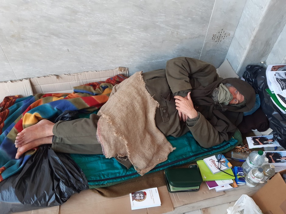 Da ben 13 giorni, dal 17 febbraio, mercoledì delle ceneri, Fratel Biagio, il missionario palermitano, fa penitenza: digiunando e pregando, affinché il virus venga sconfitto e perché nasca una società migliore. Fratel Biagio ha sentito di fermarsi accanto all’ingresso della Cattedrale di Palermo, è sistemato a terra, come tanti fissa dimora, con dei cartoni, coperte e un sacco di iuta in segno di penitenza.