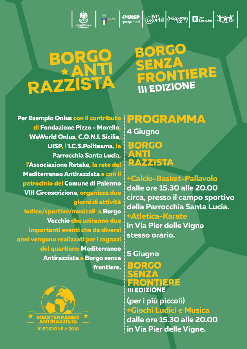 Il 4 giugno a partire dalle 15.30 si svolgerà in Via Pier delle Vigne e presso il campo sportivo della parrocchia di Santa Lucia, “Borgo Antirazzista”, quinta tappa dell’undicesima edizione della manifestazione sportiva itinerante “Mediterraneo Antirazzista 2018”. In questa occasione, i partecipanti avranno la possibilità di misurarsi in cinque diverse discipline: calcio, basket, pallavolo, atletica e karate. Il 5 giugno, negli stessi luoghi e orari, si terrà invece la terza edizione di “Borgo Vecchio senza frontiere”, un pomeriggio di gioco, attività ricreative e musica dedicato ai più piccoli.