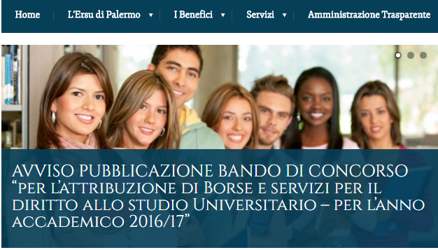 E’ stato pubblicato sul sito www.ersupalermo.gov.it il bando di concorso, anno accademico 2016/17, per l’attribuzione di borse di studio, servizi di ristorazione e alloggi riservato agli studenti delle università, delle accademie delle belle arti e dei conservatori della Sicilia occidentale (Università degli Studi, Lumsa, Accademia di belle arti di Palermo, Accademia di belle arti Kandiskij, Accademia di belle arti e di restauro Abadir di San Martino delle scale, Accademie di belle arti Michelangelo di Agrigento, Conservatorio di Musica Vincenzo Bellini di Palermo, Conservatorio di Musica Antonio Scontrino di Trapani, Istituto superiore di studi musicali Toscanini di Ribera).