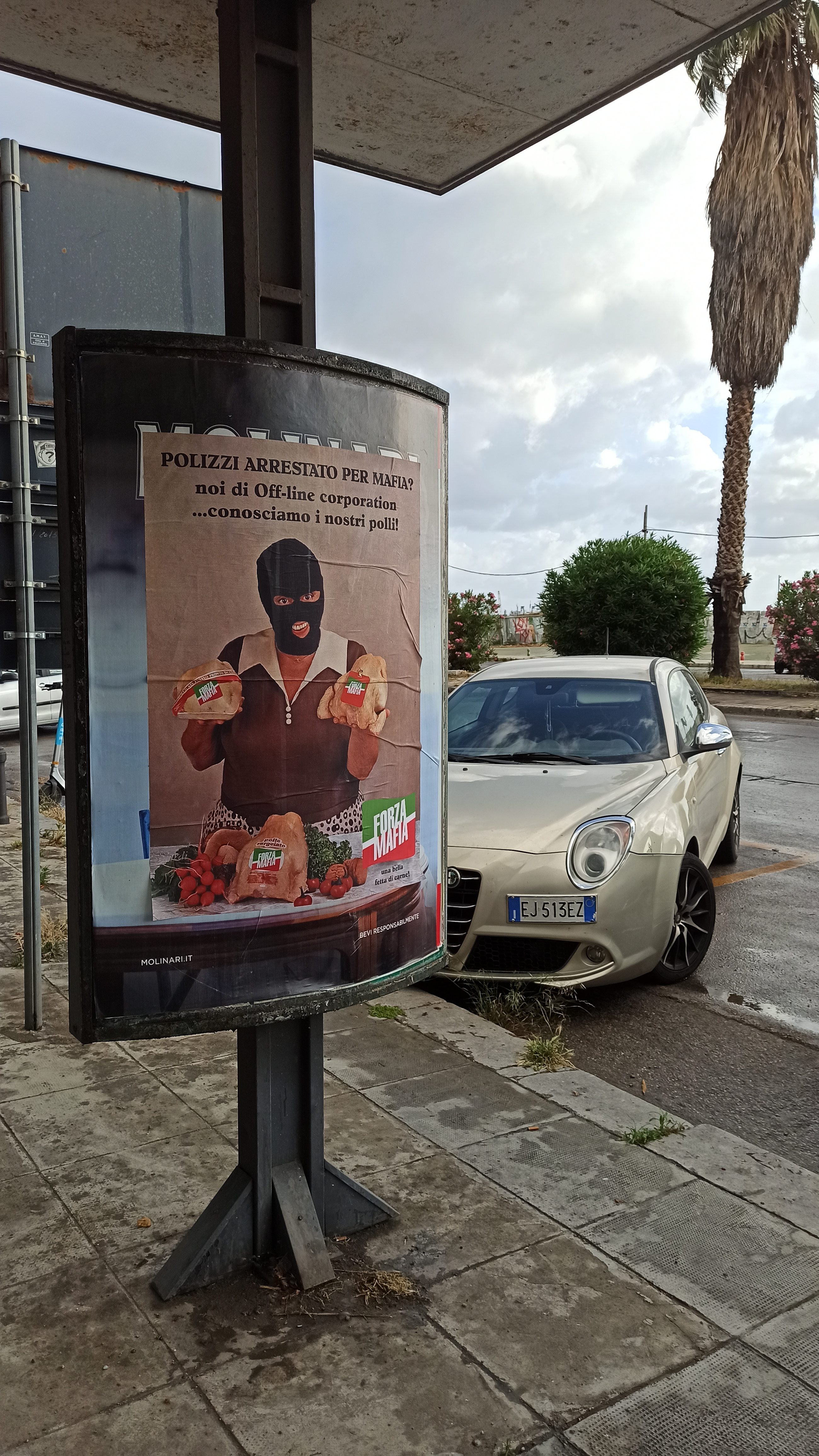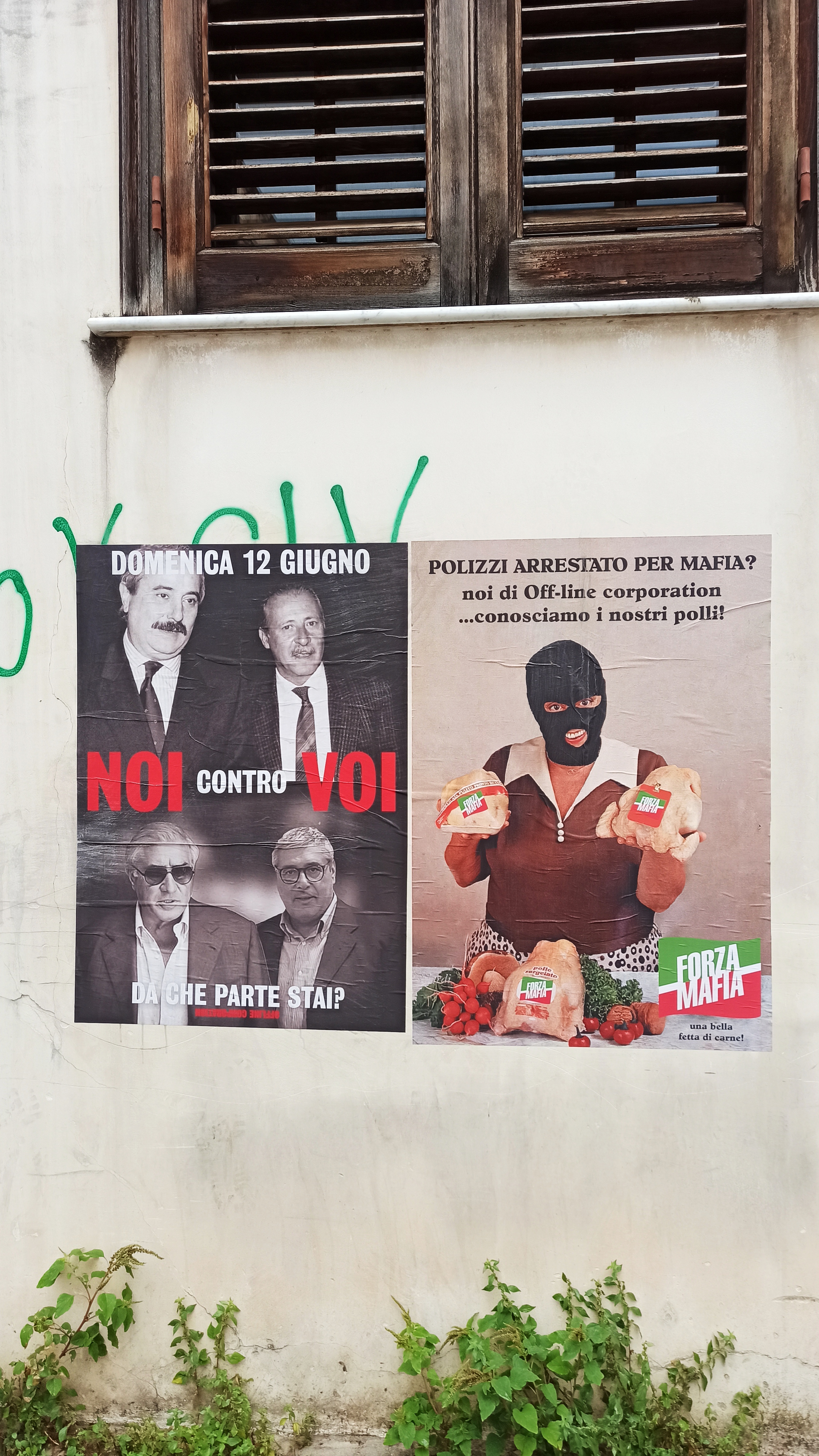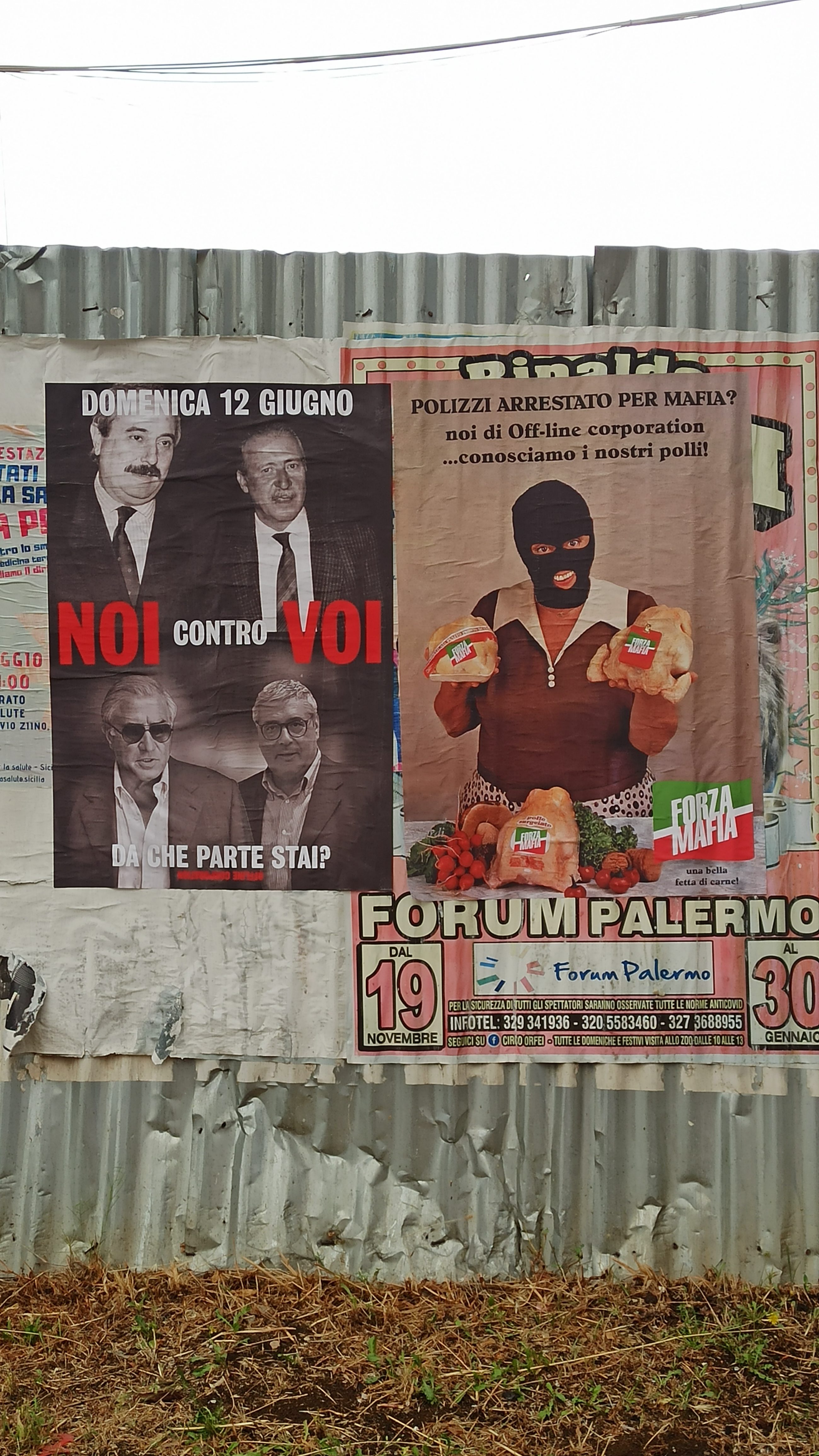 I manifesti, come ormai consueto, sono due. Nel primo una simpatica signora sorridente coperta da un passamontagna tiene in mano due polli brandizzati “Forza mafia” mentre lo slogan recita “Polizzi arrestato per mafia? …Noi di Off-line coproration conosciamo i nostri polli!” mentre in basso a destra campeggia il logo di Forza Mafia accompagnato dall’altro slogan “una bella fetta di carne!”. modo di dire palermitano che sottolinea una certa soddisfazione. Il secondo invece è un serio invito, diretto e che non lascia possibilità d’interpretazione: è un invito ad andare a votare giorno 12, con due fotografie (una di Falcone e Borsellino, l’altra di Dell’Utri e Cuffaro) con su scritto “Noi contro di voi” e la didascalia “Da che parte stai?”.