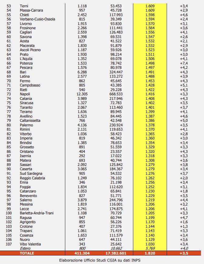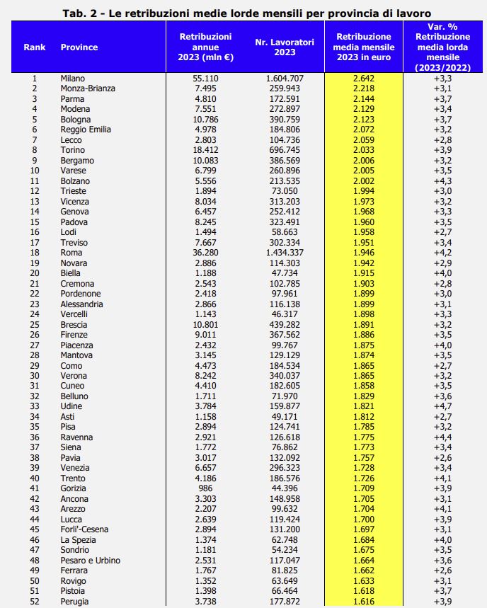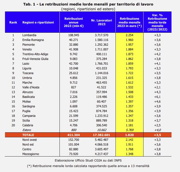 Nel 2023 il monte salari lordo erogato ai 17,3 milioni di lavoratori dipendenti privati presenti in Italia ha toccato i 411,3 miliardi di euro: equivalenti ad una retribuzione media mensile lorda di 1.820 euro, il 3,5 per cento in più rispetto al 2022, anche se l’inflazione, sempre l’anno scorso, è cresciuta molto di più, per l’esattezza il 5,7 per cento. Va segnalato, infine, che oltre il 60 per cento dell’ammontare complessivo delle retribuzioni erogate nel Paese sono state pagate ai lavoratori del Nord.