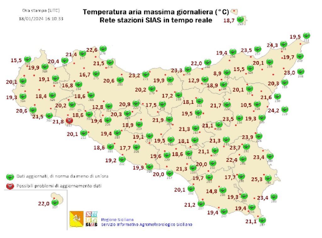 Oggi il massimo valore rilevato sulla rete Sias è stato registrato dalla stazione Siracusa con 25,3 °C, che ha eguagliato la temperatura massima assoluta di gennaio già registrata il 10 gennaio 2016.
