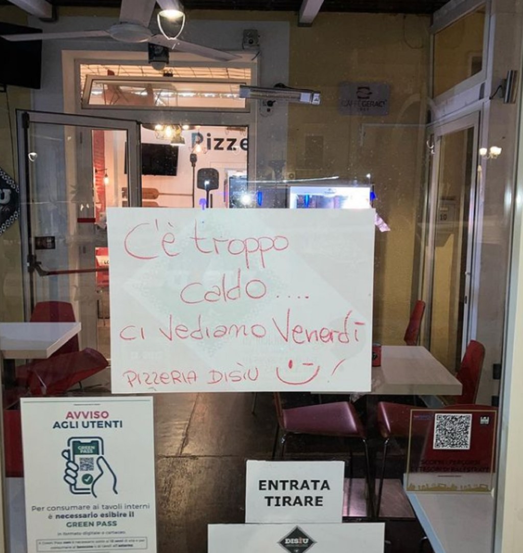 “Il ristorante Disiu Officina della Pizza comunica che questa sera 18 agosto 2022 rimarrà chiuso perché le temperature di oggi non ci permettono di lavorare in condizioni idonee quindi ci vediamo domani. Grazie per la comprensione”.