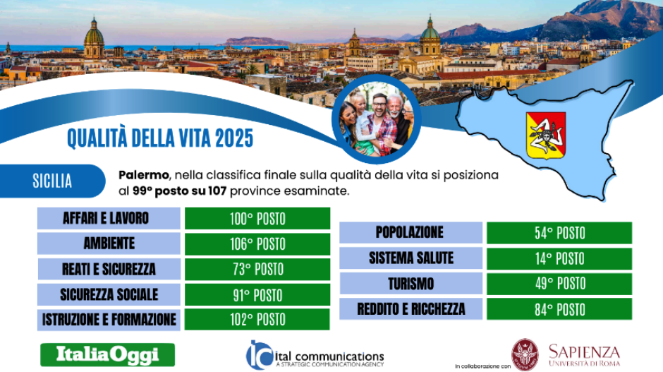 Palermo e Catania ultime per Qualità ambientale. A sorpresa, invece, Ragusa guadagna il quinto posto nella classifica sulla Sicurezza sociale.
