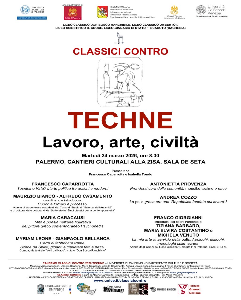 La manifestazione “Classici contro 2026”, che si terrà martedì 24 marzo p.v., a partire dalle ore 8.30, con il patrocinio gratuito della Città di Palermo, nella sala del cinema “Vittorio De Seta”, sito ai Cantieri culturali alla Zisa, è una originale manifestazione culturale su un tema fondamentale ogni anno diverso, ideata nel 2010 dall’Università Ca’ Foscari di Venezia, e ormai organizzata, in maniera autonoma ma coordinata, da un numero sempre crescente di licei classici e università di varie città italiane. Sul tema prescelto si realizza, nella forma di relazioni specialistiche ma divulgative, e di performances teatrali-musicali elaborate dagli studenti, un confronto fra idee espresse in testi ed autori classici, e problematiche contemporanee, in vista di una illuminazione reciproca.