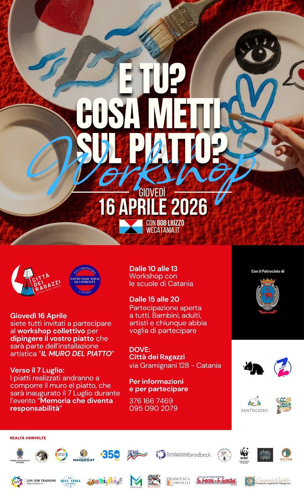 Le opere realizzate durante il workshop confluiranno in un’installazione artistica collettiva “il muro del piatto”, che sarà inaugurata il 7 luglio 2026 nell’ambito dell’evento “Memoria che diventa responsabilità”. L’appuntamento, di rilievo nazionale, segnerà il 50° anniversario della scomparsa dei “4 picciriddi” di San Cristoforo e il primo anniversario della firma del Patto Educativo di Comunità per lo sviluppo del territorio.