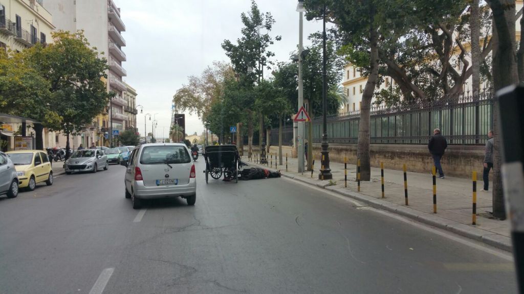 Un cavallo questa mattina che trainava una carrozza è scivolato in via Cavour a Palermo nei pressi della Prefettura e della Guardia di Finanza.